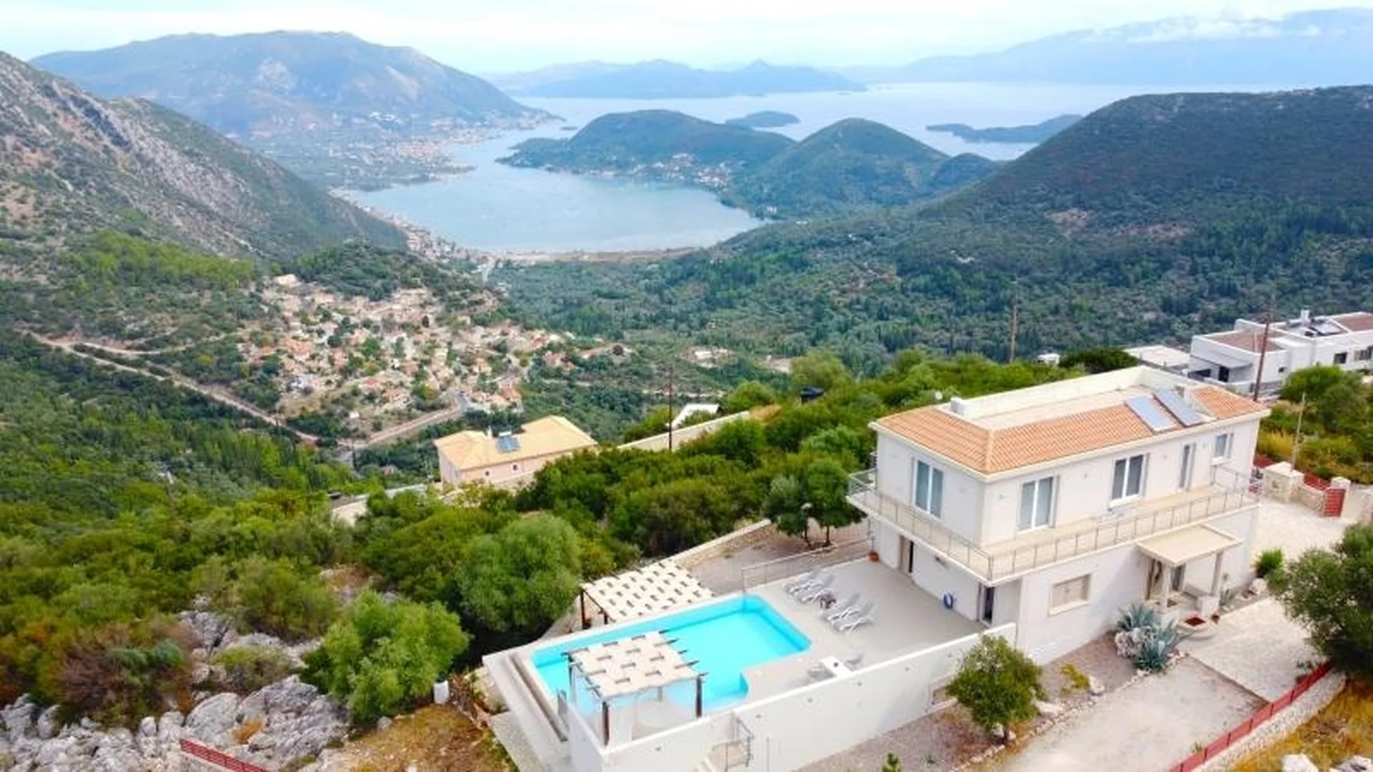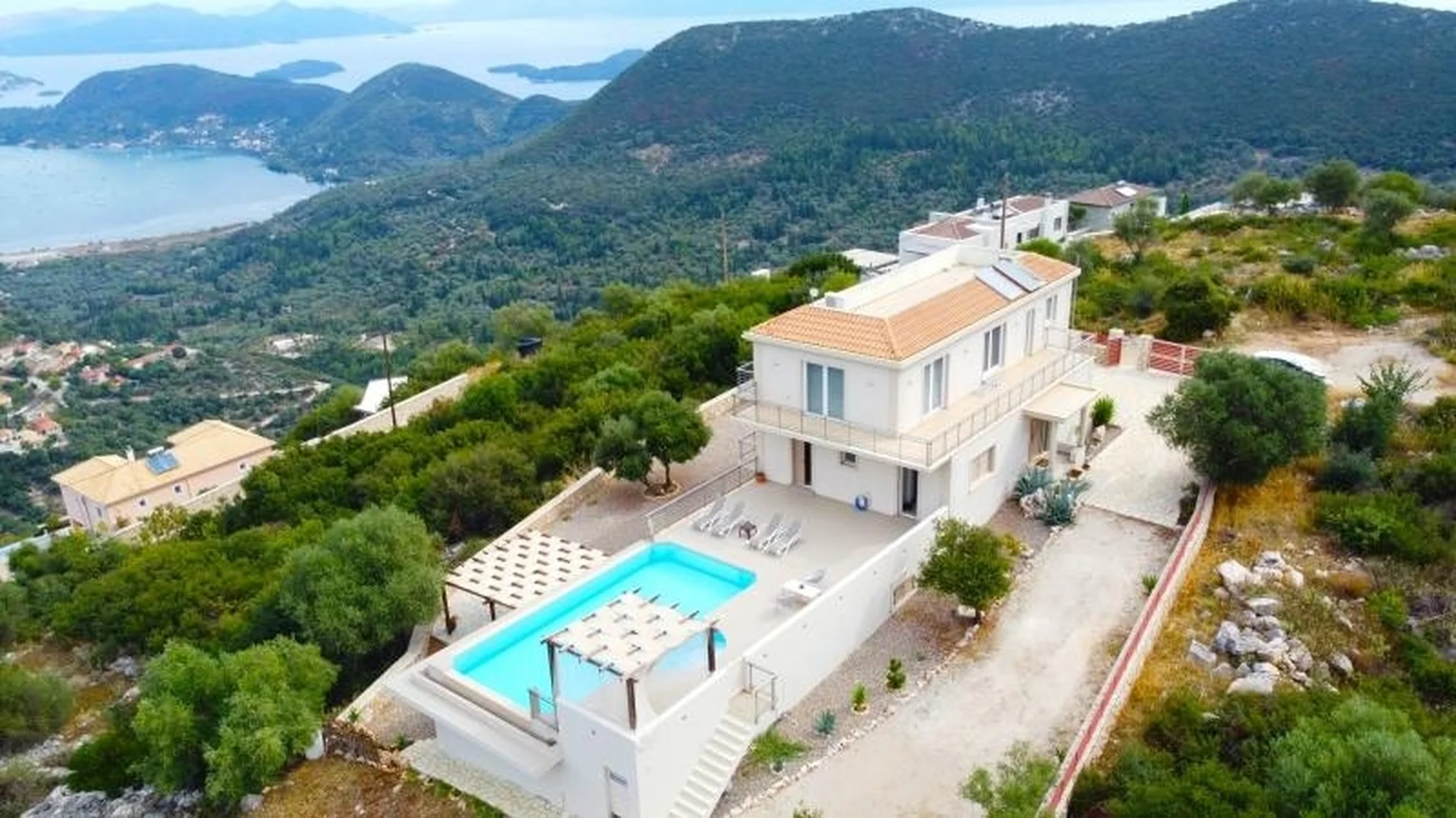 In het heuveldorp Fterno op het eiland Lefkada ligt deze villa op een ruim perceel met panoramisch uitzicht over Nidri, het eiland Skorpios en de Ionische Zee. De verhoogde ligging boven de baai zorgt voor open zichtlijnen en een blijvend vrij uitzicht over de omliggende eilanden, terwijl de kust en voorzieningen binnen korte rijafstand bereikbaar zijn.