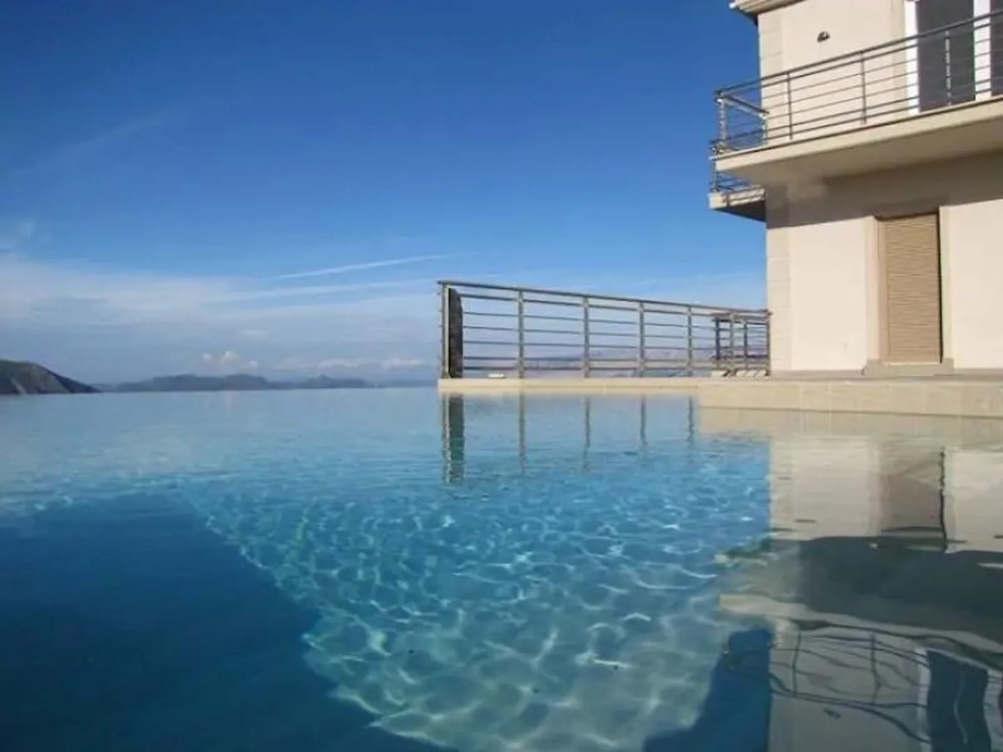 Centraal in de buitenruimte ligt het overloopzwembad van 10 × 6 meter, omringd door terrassen en zitgedeeltes met uitzicht over zee. De combinatie van hoogte, perceelgrootte en oriëntatie creëert een gevoel van ruimte en openheid dat past bij de schaal van de villa.